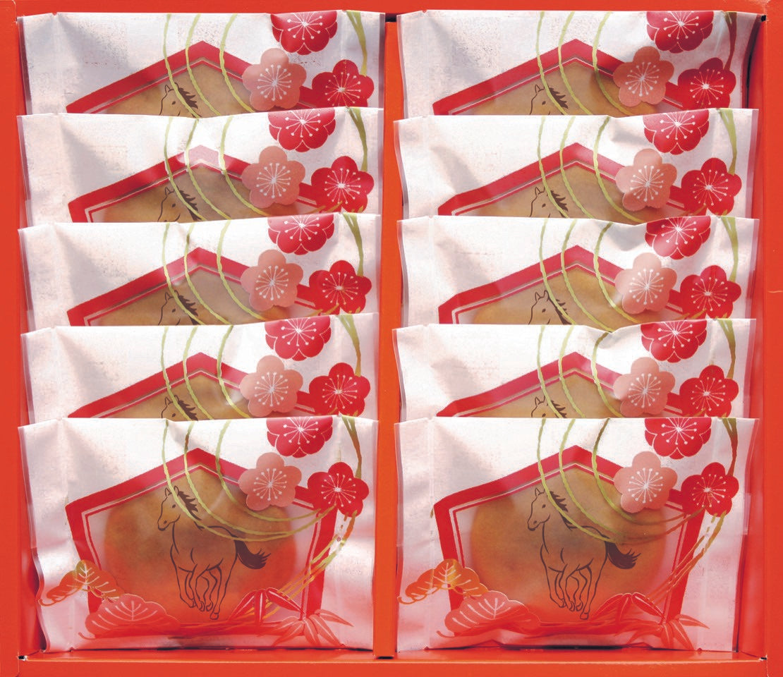 「絵馬まんじゅう」は、焼き上げたおまんじゅうに干支の絵をあしらい、絵馬をデザインした個包装にお包みした、縁起のよいお菓子でございます。
